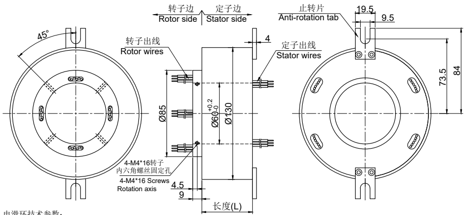 GT60130系列整体式精密导电滑环,主要应用于360度连续旋转且需要保证电源,信号不能中断的场合:多用于干燥设备(如烘干机、干燥灭菌设备、粮食烘干机等)、流延膜设备、三相交直流仪表检定装置、游乐设施(如儿 童乘骑系列游艺机、旋转木马)、研磨抛光机、起重机、安检专用设备、电影设备等任意需要360°旋转导电或传输各种控制信号的装置。
