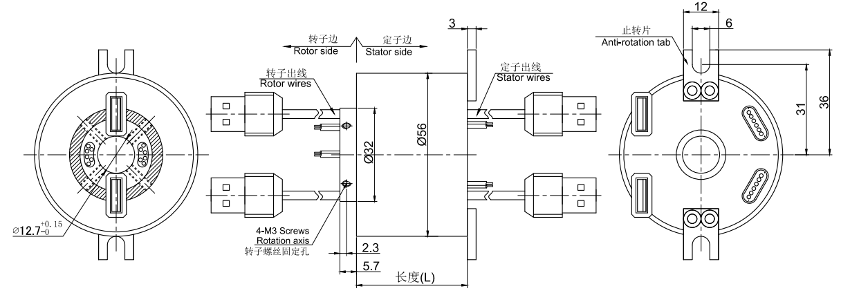 • · MUSB2122系列USB滑环,内孔12.7mm,外径为标准56mm的紧凑型整体式结构的2通道 USB1.0/USB2.0整体式精密导电滑环,