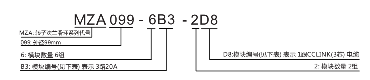 *±ÈÈçMZA099-6B3-2D8, ÆäÖÐ6B3-2D8ÊÇÖ¸£º6×é3·20A(¼´18·20A)+2×é1¸ùCCLINK(3о£©µçÀÂ